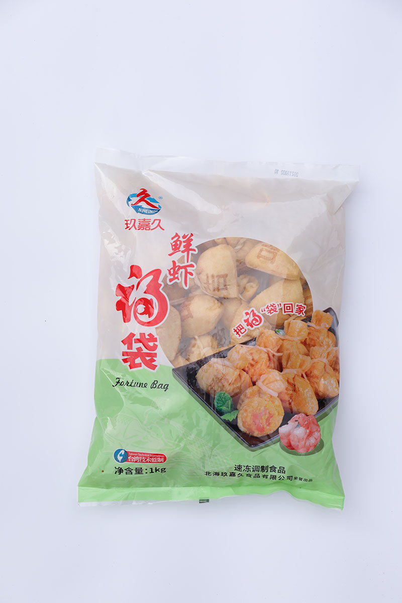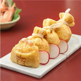 产品特性:采用优质豆皮包裹虾仁、鱼浆和鱼籽,外皮印了一个“吉”字,意头十足,形状如袋子故称福袋!